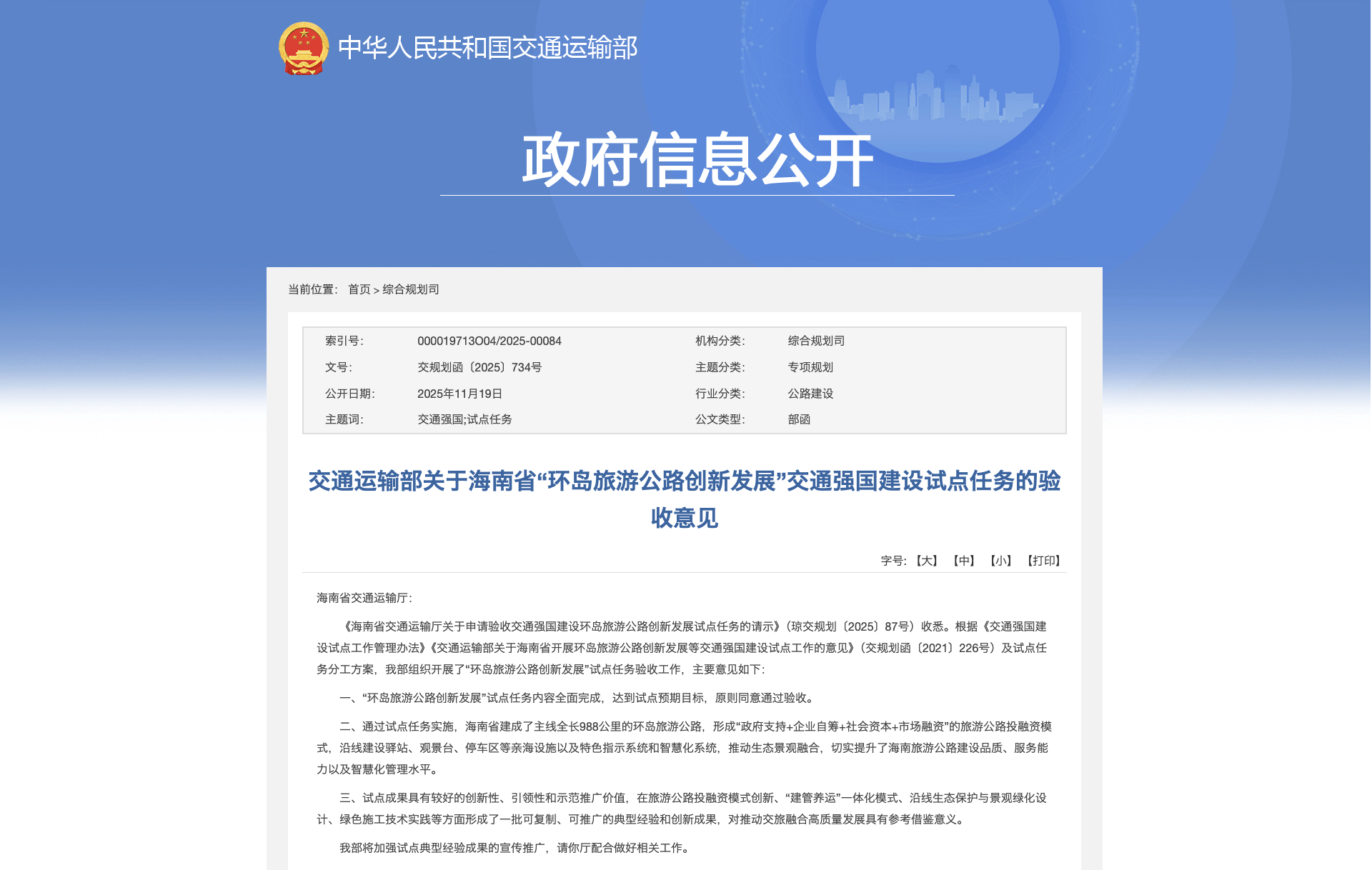 近日,海南环岛旅游公路交通强国建设试点任务顺利通过交通运输部验收,面向全国推广在旅游公路建管养、交旅融合等方面形成的典型经验。作为试点任务重要组成部分,yp电子科技承建的环岛旅游公路云控中心有效提升海南环岛旅游公路智慧化管理水平与服务能力,助力打造国家级智慧旅游公路。
